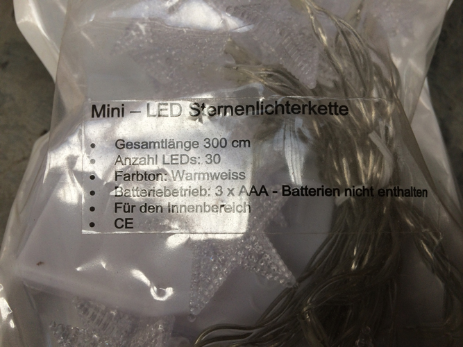 30 Sterne, warmweiß mit LEDs.