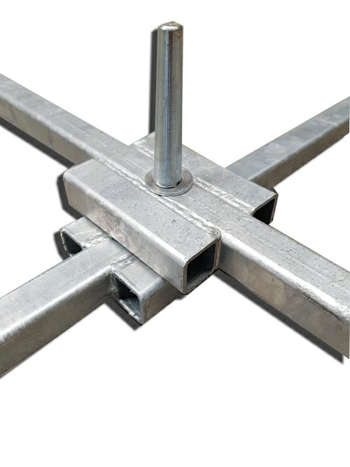 Feuerverzinktes, klappbares Metallkreuz aus 3mm Vierkantstahl zum Präsentieren von bis zu fünf Bäumen.