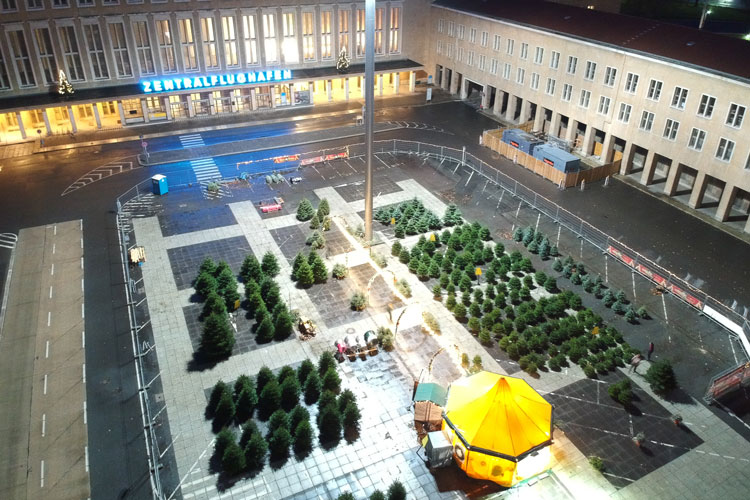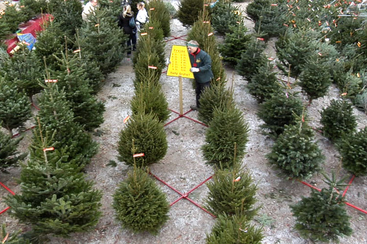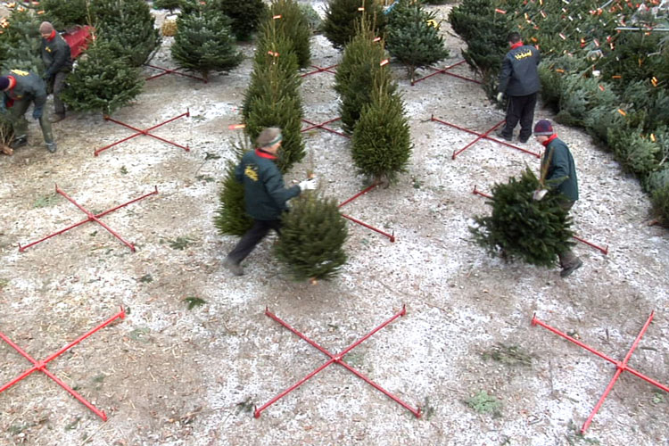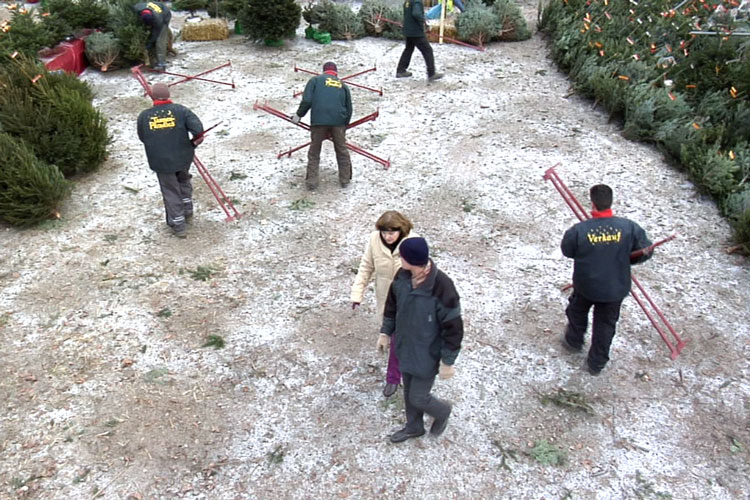 Bäume stehen gerade in voller Pracht und müssen nicht liegend von den Kunden "sortiert" und in die Hand genommen werden.
